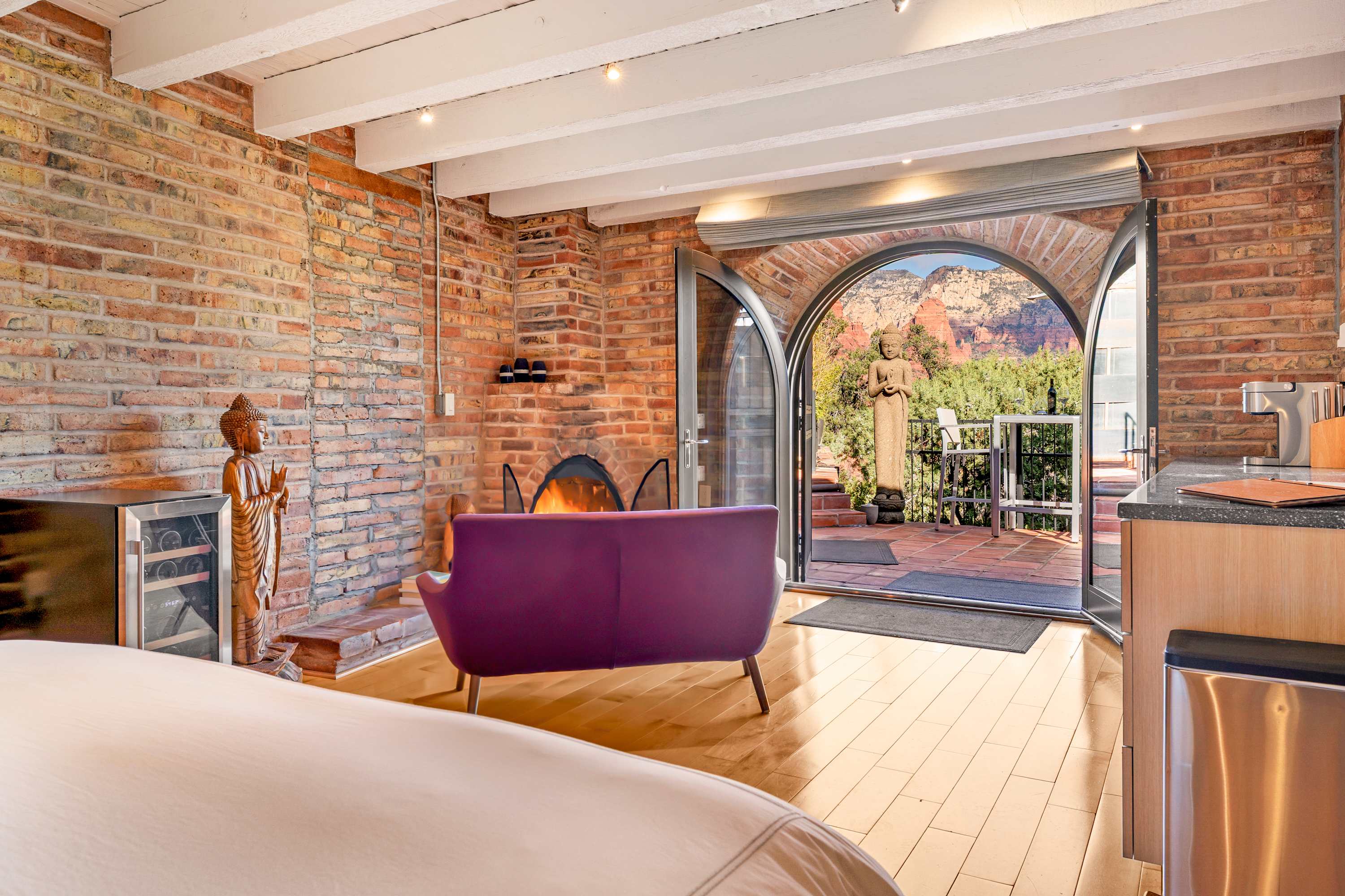 Experience The Guest Suite at Eagle Dancer as your own secluded wellness retreat. Cozy up beside the original kiva fireplace, or step out onto your patio to take in the sweeping red rock views, whether it’s a quiet sunrise or a soft desert evening settling in around you.