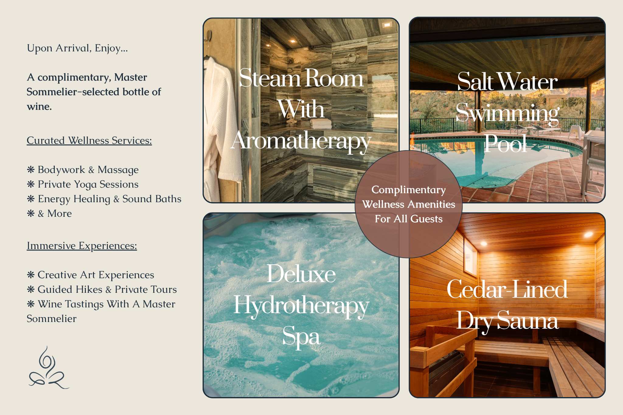 The Upper Casita at Eagle Dancer offers a rare stay within one of Sedona’s most iconic private estates, framed by sweeping red rock views. This elevated retreat features a private balcony, kiva fireplace, and seamless indoor-outdoor living designed for quiet luxury & connection. Enjoy Complimentary Access: *Eucalyptus-infused steam room & cedar dry sauna *Saltwater pool & hydrotherapy hot tub *Serene spaces for yoga, meditation *Gated grounds w/ peaceful walking paths *15+ private hiking trails